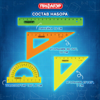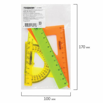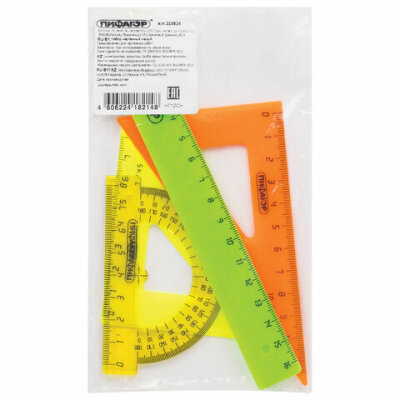 Набор чертежный малый ПИФАГОР (линейка 16 см, 2 треугольника, транспортир), неоновый, пакет, 210624
