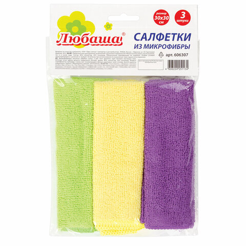 Салфетки из МИКРОФИБРЫ универсальные 30х30 см, КОМПЛЕКТ 3 шт., ассорти, 220 г/м2, ЛЮБАША ПЛЮС, 606307