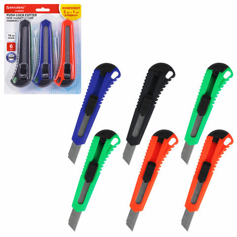 Нож канцелярский 18 мм, КОМПЛЕКТ "5 шт. + 1 шт. В ПОДАРОК", фиксатор, блистер, BRAUBERG "Classic", 238773