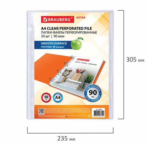 Папки-файлы перфорированные А4 BRAUBERG "EXTRA 900", КОМПЛЕКТ 50 шт., гладкие, ПЛОТНЫЕ, 90 мкм, 229670