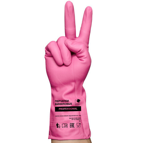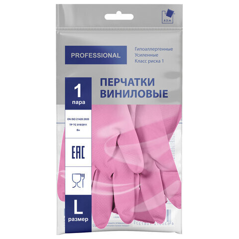 Перчатки МНОГОРАЗОВЫЕ виниловые РОЗОВЫЕ усиленные ГИПОАЛЛЕРГЕННЫЕ, ТР ТС, PROFESSIONAL, размер 8-9, L (большой), вес 90 г, ADM, 31157