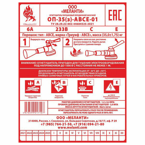 | Масса огнетушащего вещества | 35 кг |