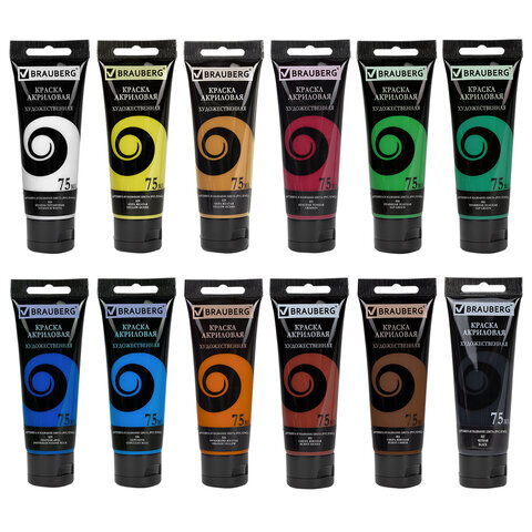 Краски акриловые художественные матовые 12 цветов в тубах по 75 мл, BRAUBERG ART DEBUT, 192419