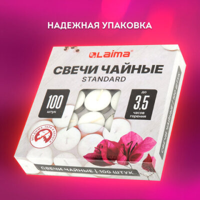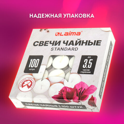 Свечи чайные Standard, до 3,5 часов горения, вес 9 г, КОМПЛЕКТ 100 шт., в гильзе, LAIMA, 609198