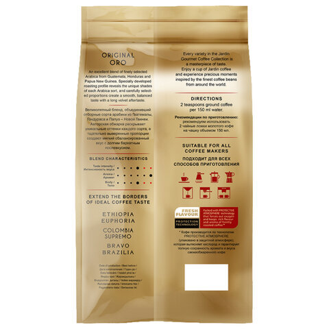Кофе JARDIN "Original Oro" - это бленд из отборных сортов арабики из трех регионов. Авторская обжарка раскрывает уникальные оттенки каждого сорта, а тщательно выверенные пропорции создают мягкий сбалансированный вкус с долгим бархатным послевкусием.