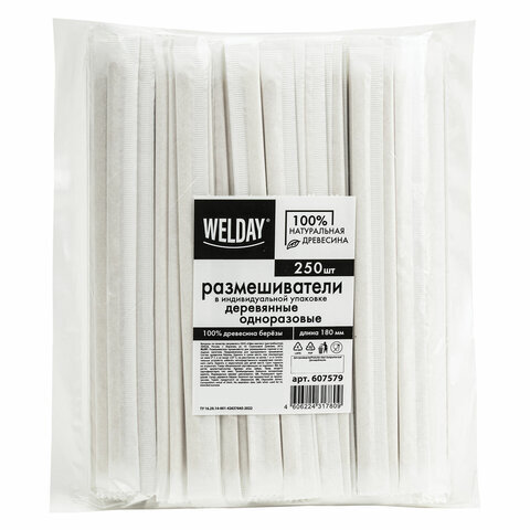Размешиватель одноразовый деревянный в индивидуальной упаковке 180 мм, КОМПЛЕКТ 250 шт., WELDAY (ВЭЛДЭЙ), 607579, 97