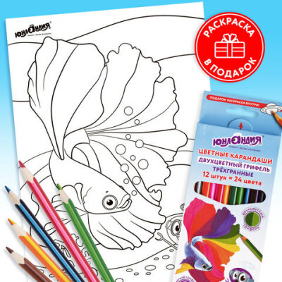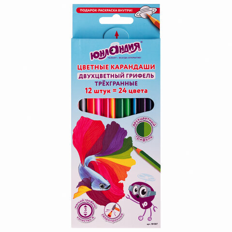 Карандаши цветные с двухцветным грифелем ЮНЛАНДИЯ "МОРСКИЕ ЖИТЕЛИ", 12 штук, 24 цвета, трехгранные, грифель 3 мм, натуральное дерево, 181587