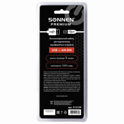 Кабель USB 2.0 AM-BM, 3 м, SONNEN Premium, медь, для подключения принтеров, сканеров, МФУ, плоттеров, экранированный, черный, 513129