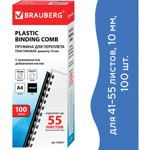Пружины пластиковые для переплета, КОМПЛЕКТ 100 шт., 10 мм (для сшивания 41-55 л.), черные, BRAUBERG, 530813