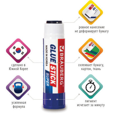 Обесцвечивающийся клей-карандаш BRAUBERG SUPER помогает аккуратно и равномерно нанести клеевой слой на поверхность. Идеально подходит для офиса, дома и школы.
