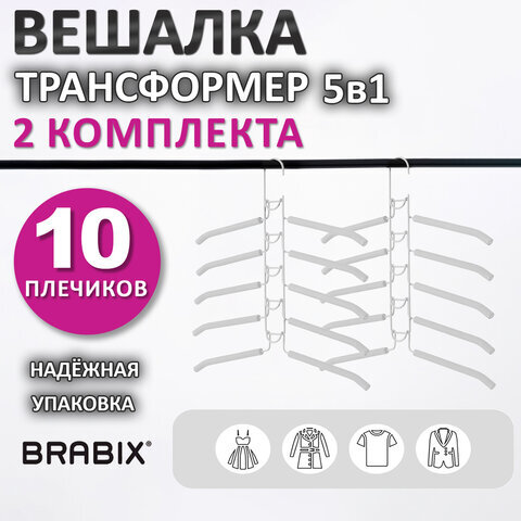 Вешалка-плечики трансформер 2 КОМПЛЕКТА (10 плечиков) металл с покрытием, белые, BRABIX, 880786