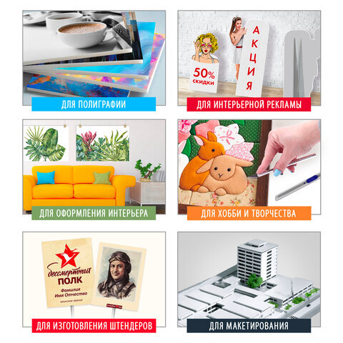 Пенокартон BRAUBERG представляет собой легкий, но прочный лист вспененного полистирола, оклеенный с обеих сторон матовым бумажным покрытием. Это гладкий материал, применяемый в разнообразных видах работ.
