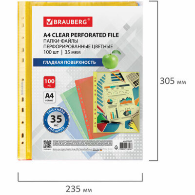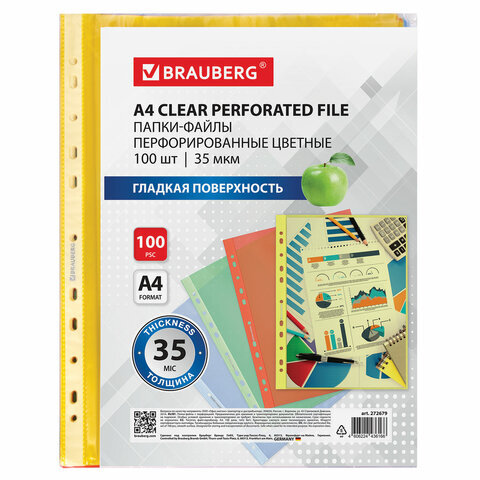 Папки-файлы перфорированные ЦВЕТНЫЕ ассорти А4 BRAUBERG, комплект 100 шт., гладкие, 35 мкм, 272679