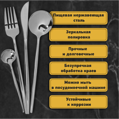 | Комплектация | вилки, ножи, столовые ложки, чайные ложки |