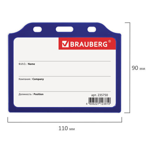 Бейдж горизонтальный жесткокаркасный (75х105 мм), без держателя, СИНИЙ, BRAUBERG, 235750