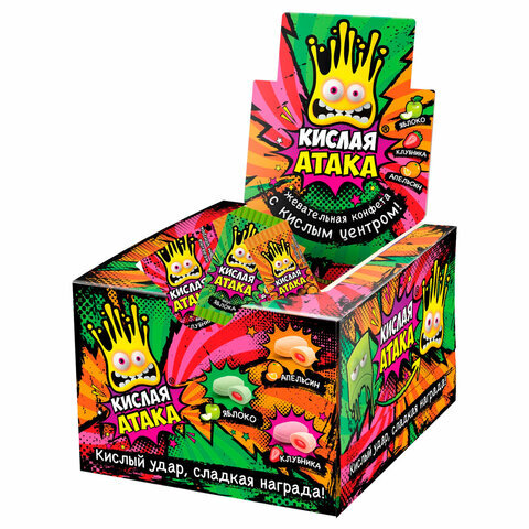 "КИСЛАЯ АТАКА" – это жевательные конфеты с кислым центром, которые понравятся всем любителям кислых вкусов! В линейке представлено три вкуса: апельсин, яблоко и клубника.