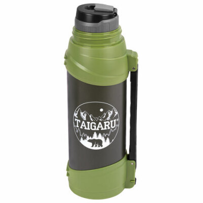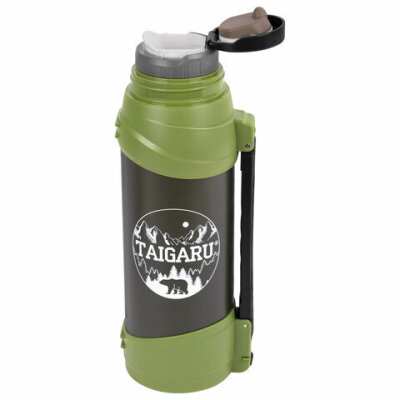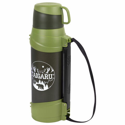 Термос классический, нержавеющая сталь, 2 л, черно-оливковый, 2 кружки, ручка + ремешок, TAIGARU (ТАЙГАРУ), 608816