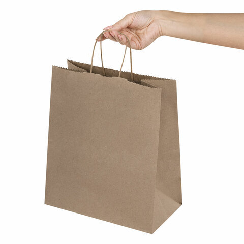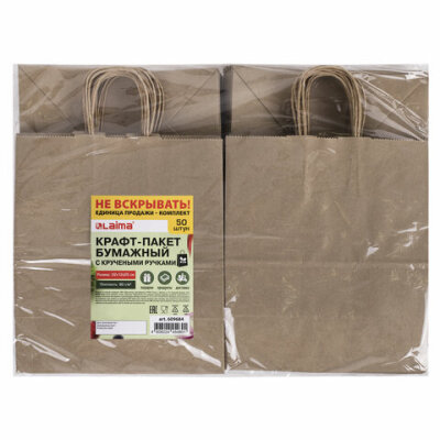 Крафт-пакет бумажный 22х12х25 см, КОМПЛЕКТ 50 шт., крученые ручки, плотность 90 г/м2, LAIMA ECO CRAFT, 609684
