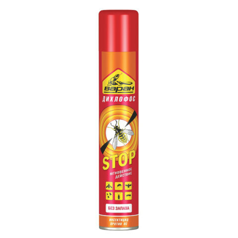 Средство инсектицидное ДИХЛОФОС "Варан" для эффективного уничтожения ос и осиных гнезд, а также для уничтожения летающих (мухи, комары, москиты) и нелетающих (тараканы, муравьи) насекомых в помещениях. Мгновенное действие, без запаха.