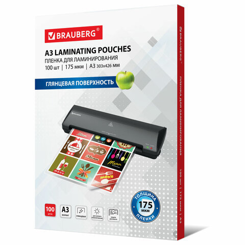 Пленки-заготовки для ламинирования БОЛЬШОГО ФОРМАТА, А3, КОМПЛЕКТ 100 шт., 175 мкм, BRAUBERG, 531778