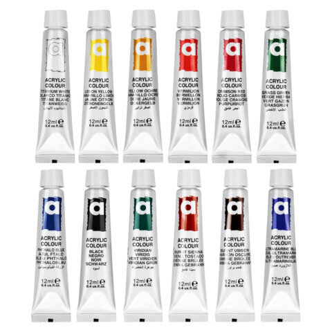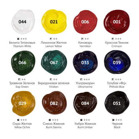 | Цвет | белила титановые, виридоновый зеленый (067), голубой ФЦ (039), киноварь (006), красная темная (001), лимонная желтая (021), охра желтая (029), сиена жженая (082), травяной зеленый (066), ультрамарин (033), умбра жженая (084), черный (051) |