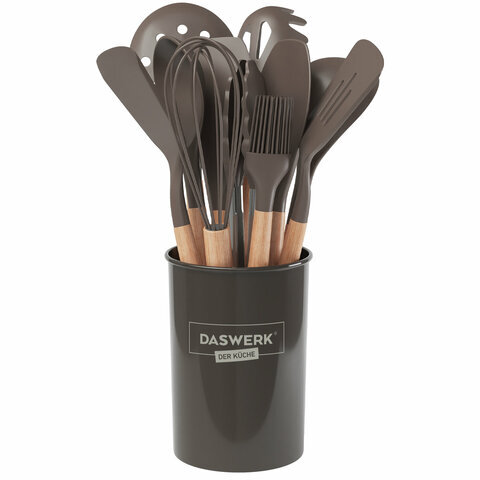 Набор силиконовых кухонных принадлежностей с деревянными ручками 12 в 1, серо-коричневый, DASWERK (ДАСВЕРК), 608195
