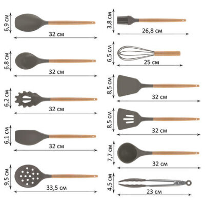 Состав набора лопатка для жарки, шпатель, венчик, щипцы, плоская ложка для выпечки, лопатка с отверстиями для слива масла, половник, ложка для салата, кисточка для масла, ложка для спагетти и шумовка