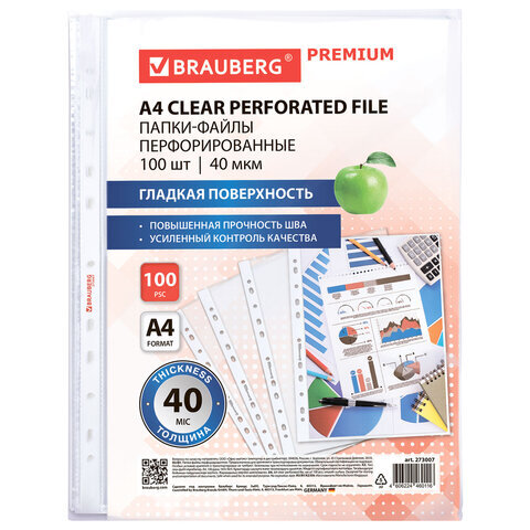Папки-файлы перфорированные А4 BRAUBERG "PREMIUM", КОМПЛЕКТ 100 шт., гладкие, 40 мкм, 273007