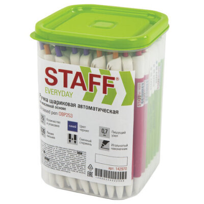 Ручка шариковая масляная автоматическая STAFF "OBP-253", СИНЯЯ, корпус ассорти, узел 0,7 мм, линия письма 0,35 мм, 142970