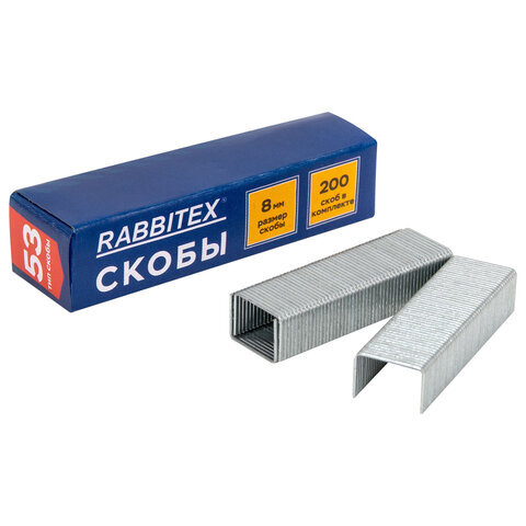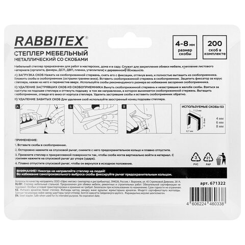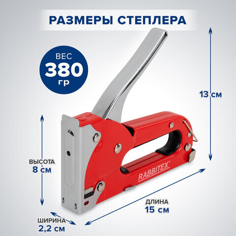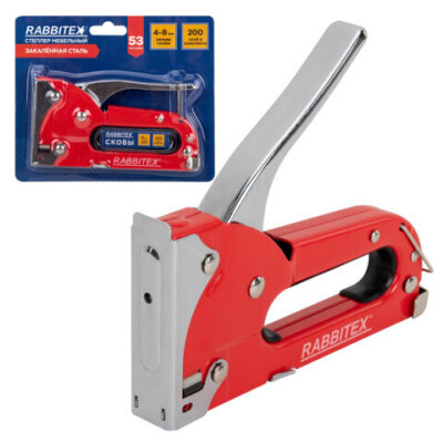 Степлер мебельный стальной, тип скобы 53, высота скоб 4-8 мм, 200 скоб 8 мм в комплекте, RABBITEX (РАББИТЕКС), 671322