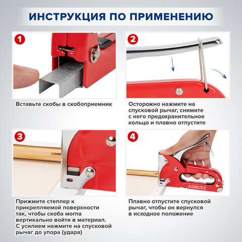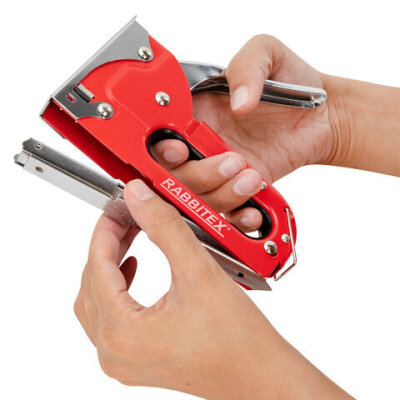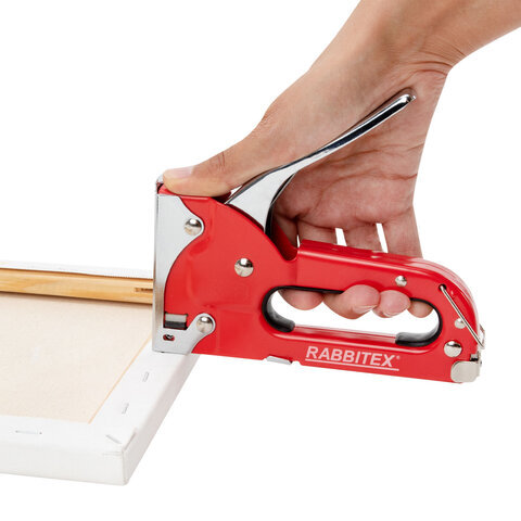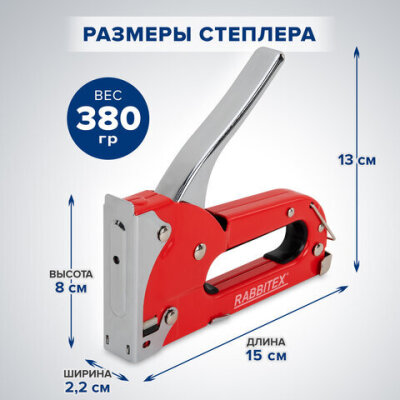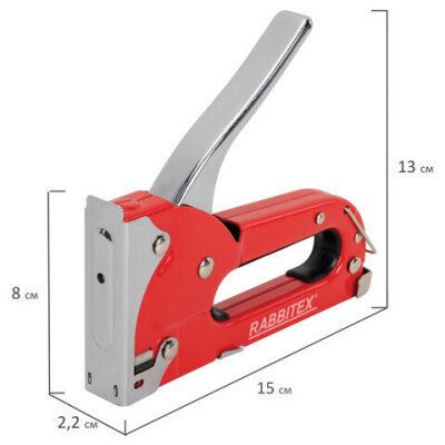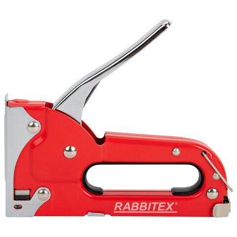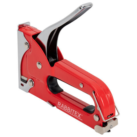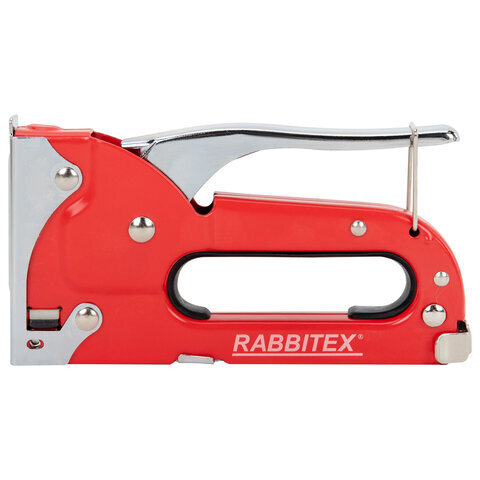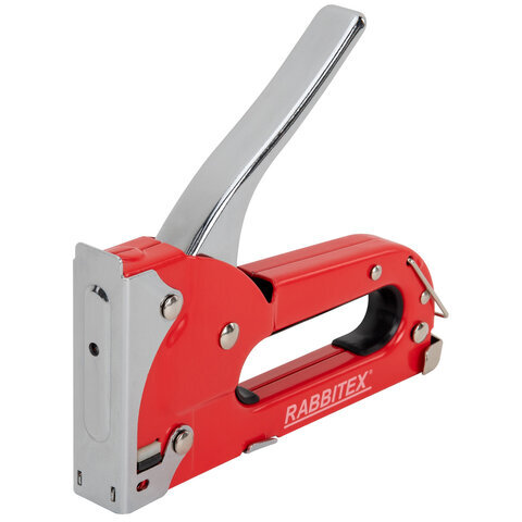 Степлер мебельный RABBITEX применяется для обивки мебели, крепежа листового материала (ДВП, ДСП, фанеры), а также пленки и теплоизоляционного материала к деревянному основанию. Предназначен для широкого использования в мастерских, дома, на даче.
