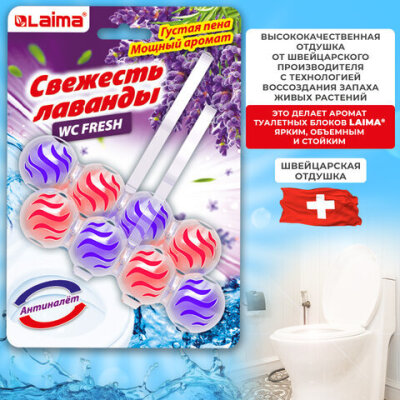 Туалетный блок шарики для унитаза освежитель, 2 блока по 50 г, "Свежесть Лаванды 3 в 1", LAIMA, 608993