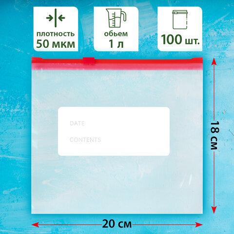 Пакеты для заморозки продуктов, 1 л, КОМПЛЕКТ 100 шт., с замком-застежкой (слайдер), LAIMA