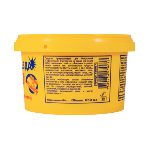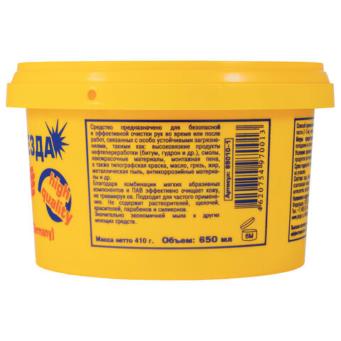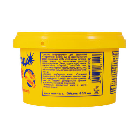 • Паста ЧИСТАЯ ЗВЕЗДА – нейтральное средство для эффективной очистки кожи рук от масла, смазок, монтажной пены, типографской краски, графита, плиточного клея, битума, сажи, антикоррозийных материалов, производственной пыли, грязи и других загрязнений.