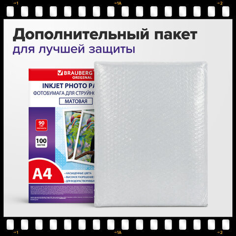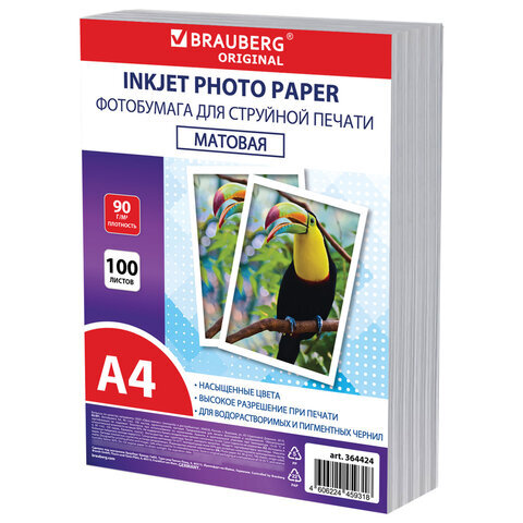 Фотобумага матовая, А4, 90 г/м2, односторонняя, 100 листов, ПАКЕТ, BRAUBERG ORIGINAL, 364424