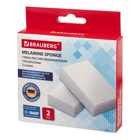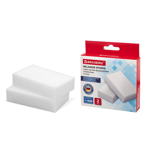 Губка-ластик МЕЛАМИНОВАЯ для удаления пятен, для чистки кухни, уборки, обуви, 10,5х6х2,5 см, КОМПЛЕКТ 2 шт., колорбокс, BRAUBERG, 606892