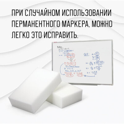 Меламиновая губка-ластик удаляет различные стойкие загрязнения, такие как: следы перманентного маркера с твердых поверхностей. Убирает мыльный налет в ванной, удаляет некоторые пятна с одежды. Идеальны для маркерных досок. P.S: СМОЧИТЬ ПЕРЕД ПРИМЕНЕНИЕМ.