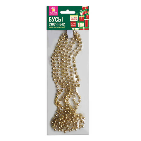 Бусы ёлочные диаметр 7,5 мм, длина 2,7 м, пластик, золотистые, ЗОЛОТАЯ СКАЗКА, 591136