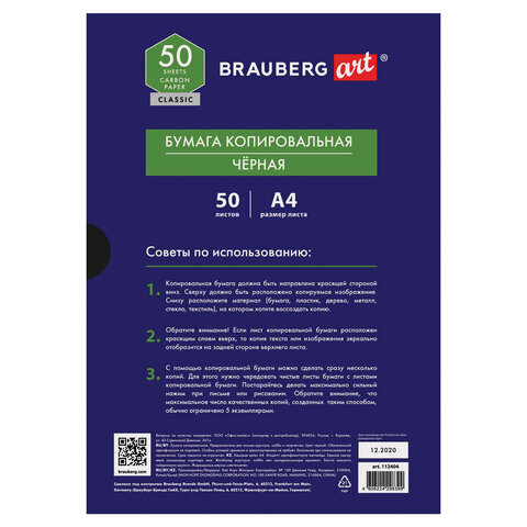 Бумага копировальная (копирка) черная А4, 50 листов, BRAUBERG ART "CLASSIC", 112404