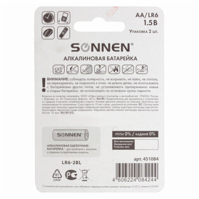 Батарейки КОМПЛЕКТ 2 шт., SONNEN Alkaline, АА (LR6, 15А), алкалиновые, пальчиковые, блистер, 451084
