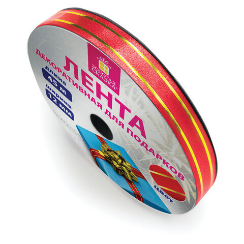 Лента упаковочная декоративная для подарков, золотые полосы, 12 мм х 45 м, красная, ЗОЛОТАЯ СКАЗКА, 591823