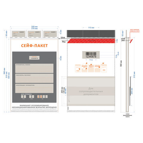 | Особенности | индивидуальный номер, карман для сопроводительных документов, красная сейф-лента с термоиндикацией, подсказ «Куда-Кому», штрихкод |