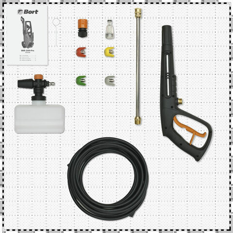 | Комплектация | игла для очистки сопла, коннектор для шланга быстросъемный, насадка-пистолет, пеногенератор, сменные форсунки, струйная трубка, фильтр для воды, шланг высокого давления |