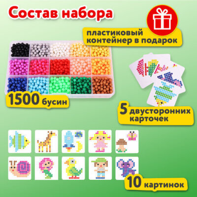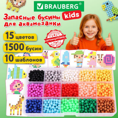 Запасные бусины для АКВАМОЗАИКИ с карточками-трафаретами 15 цветов 1500 штук, BRAUBERG KIDS, 664914