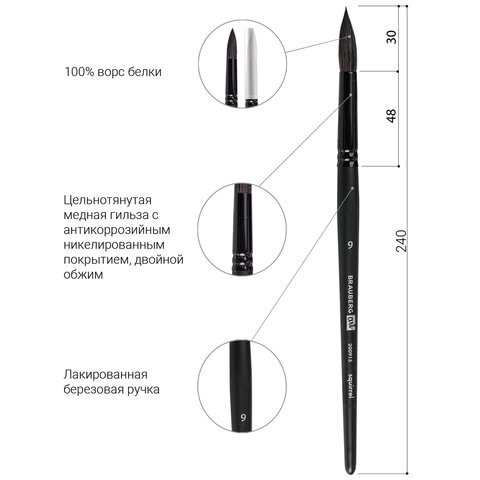 Кисть художественная проф. BRAUBERG ART CLASSIC, белка, круглая, № 9, 200915