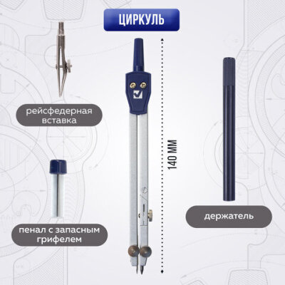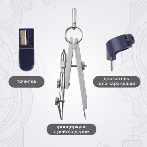 | Комплектация | держатель, кронциркуль, пенал с запасным грифелем, рейсфедерная вставка и держатель, точилка, циркуль |
