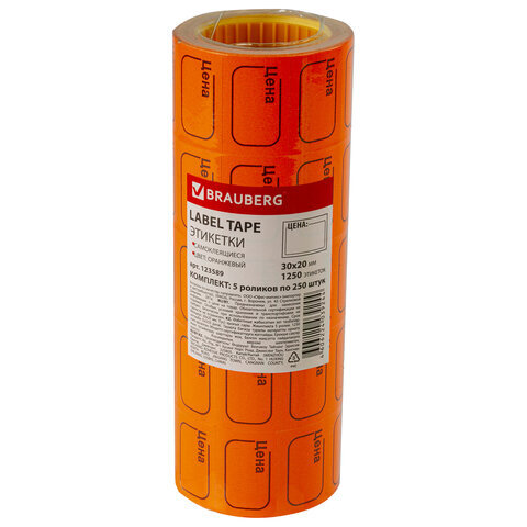 Ценник малый "Цена", 30х20 мм, оранжевый, самоклеящийся, КОМПЛЕКТ 5 рулонов по 250 шт., BRAUBERG, 123589
