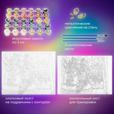 | Комплектация | акриловые краски, кисть, крепеж, лист бумаги для тренировки, холст на подрамнике |