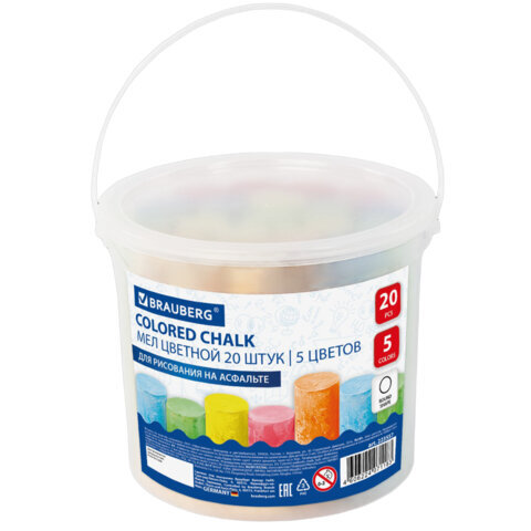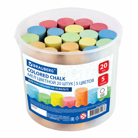 Мел в ведерке для рисования на асфальте 20 штук, 5 цветов, цветной круглый, BRAUBERG, 223557