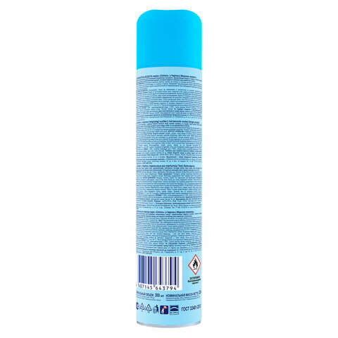 Легко устраняет неприятные запахи, надолго наполняя воздух неповторимым ароматом морского воздуха. Клапан распылителя с очень мягким нажатием удобен в применении. Не содержит озоноразрушающих веществ.